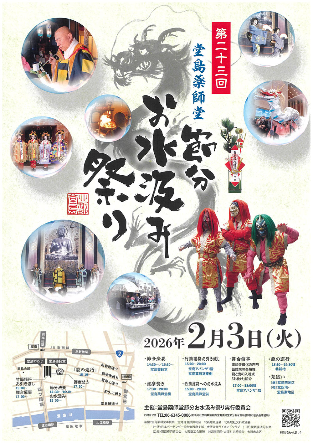例年は、堂島薬師堂で奈良薬師寺による節分法要のあと、薬師寺で祈祷された「お香水」を汲む「お水汲み」が始まります。また、薬師堂から7体の鬼が放たれ、堂島北新地を徘徊します。堂島の「鬼追い」は、先導役・福男・山伏・鬼の手引・鬼・豆持ち・銅鑼(どら)持ちなど1隊あたり7~8名で構成されています。節分(鬼追い)で1年の厄を払い、早春の若水をいただき、福を授かるという水の都大阪の新春にふさわしいお祭りです。